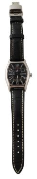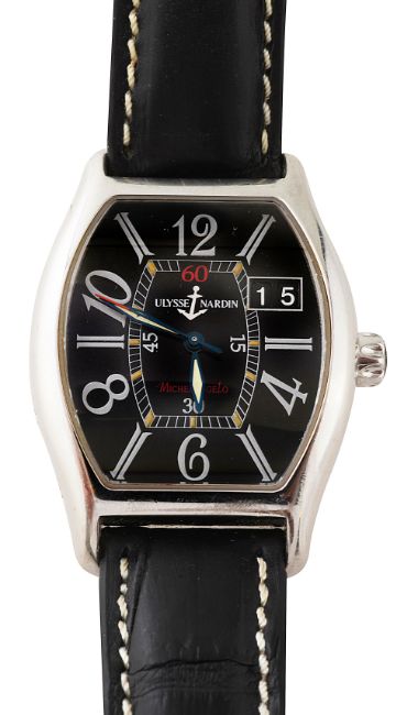 black dial with alternating silver filled black batoon and Arbaic numeral hour markers,, inner minute track with luminous dot five minute markers, luminous dagger hands and centre seconds, date aperture at 2 o'clock, tonneau shaped case, leather strap with deployant butterfly buckle clasp, in box stamped Ulysee Nardin