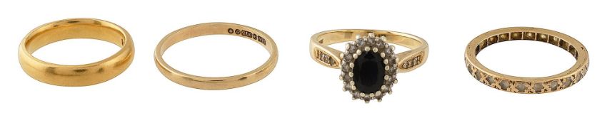 including a 22ct wedding band, a 9ct yellow gold wedding band, and a 9ct gold, sapphire and diamond-set cluster ring, (4)