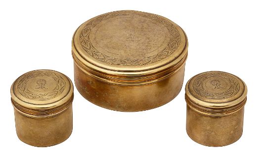 comprising a circular larger box and pair smaller pots, the pull off lids with bright cut border and crested with a wheatsheaf and three crossed arrows