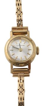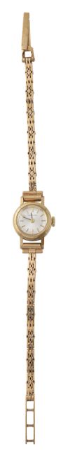 circular brushed steel dial with raised gilt hour batons signed Longines, manual wind 17 jewels movement signed Longines and numbered, fancy link 9ct gold bracelet with fold over clasp,
