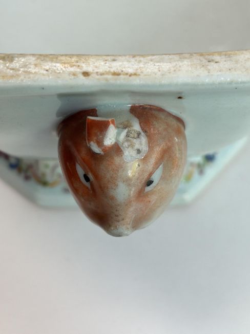 Condition: small loss to ears of one rabbit handle. Small small flake chips to pomegranate finial and leaf wrapping round it. Some rubbing to enamel on lid and body principally rock work more so on one side