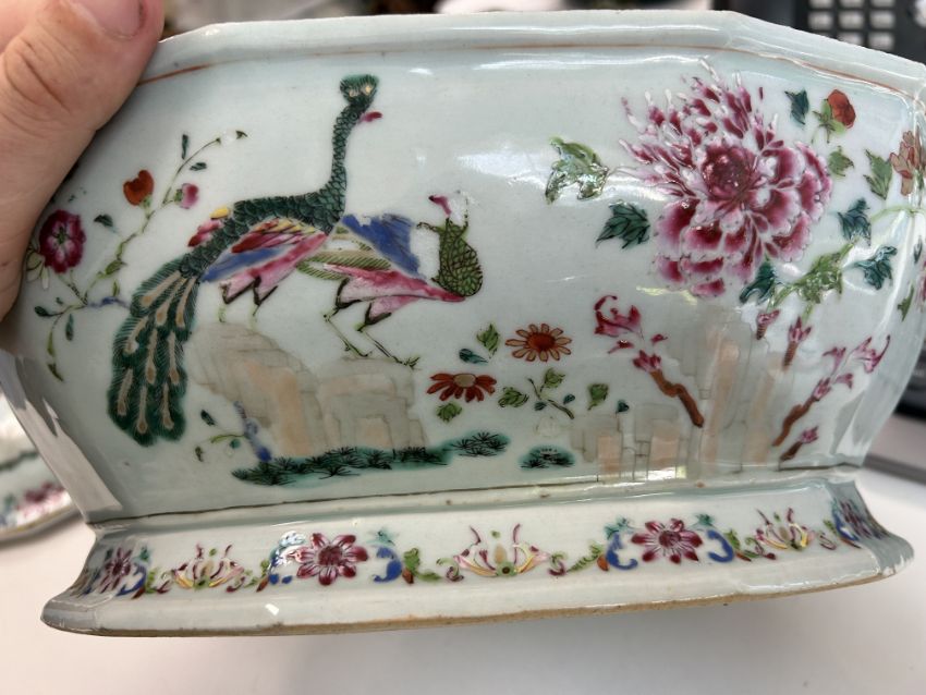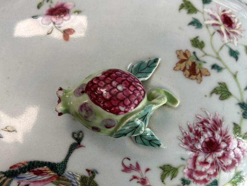 A late 18th century Chinese export famille rose 'double peacock' porcelain tureen and cover