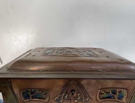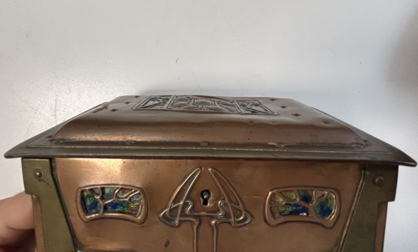 An Austrian Jugendstil Secessionist brass, copper and enamel jewellery casket