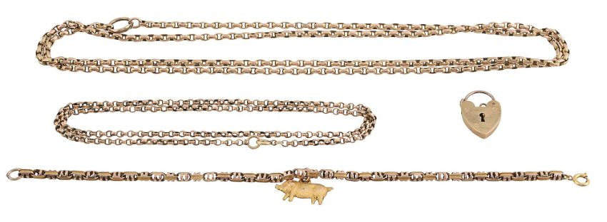 a trace-link chain, stamped '12k' to clasp; a fancy link chain bracelet suspending a pig chain; 9ct gold heart padlock, hallmarked and a chain (4)