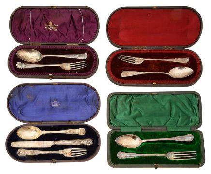 comprising an early Victorian Kings pattern knife with filled handled, fork and spoons set, London, 1865, George Adams, a late Victorian foliate engraved spoon and fork, London, 1895, Charles Boyton, initialled a long shell pattern knife and spoon, Sheffield, 1895, Atkin Brothers, and another set, initialled, (4)