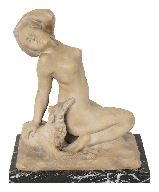 Auguste Carli, (French, 1868-1930) An Art Deco painted terracotta figure of a nude reclining female figure and a recumbent dog, signed A. Carli 2135 Made Belgium, on a black veined marble base