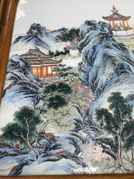 painted with a mountainous river landscape with pavillions, tress and figures, hardwood frame, mounted in a modern gilt frame, bears label Julkus G. Haas Fine Arts New York