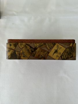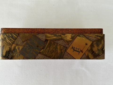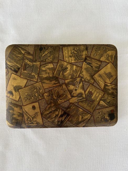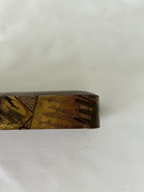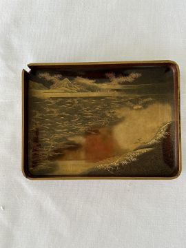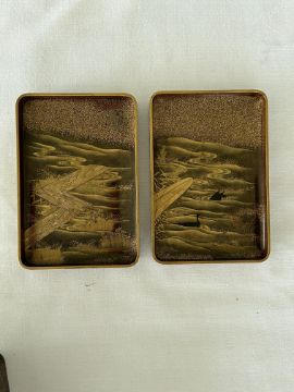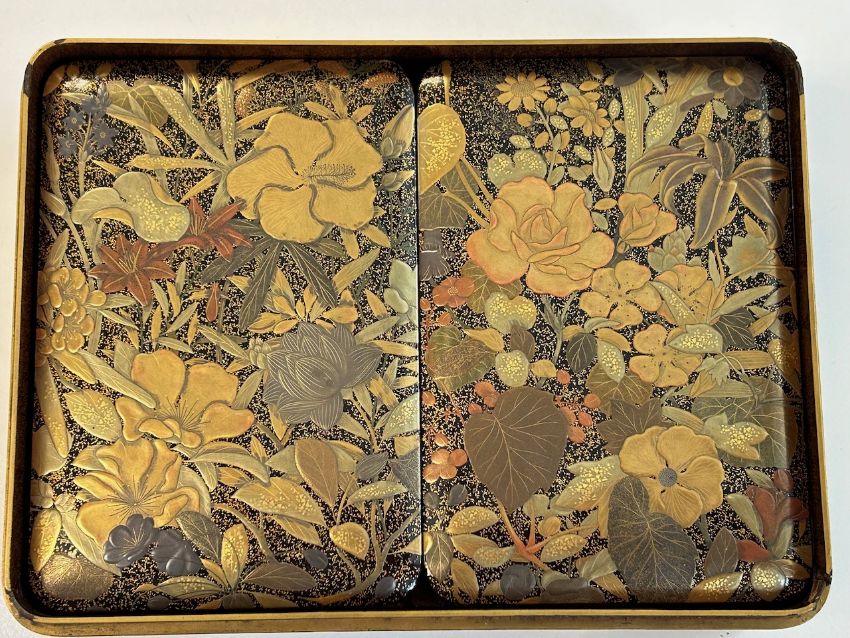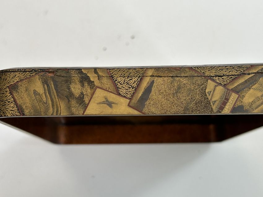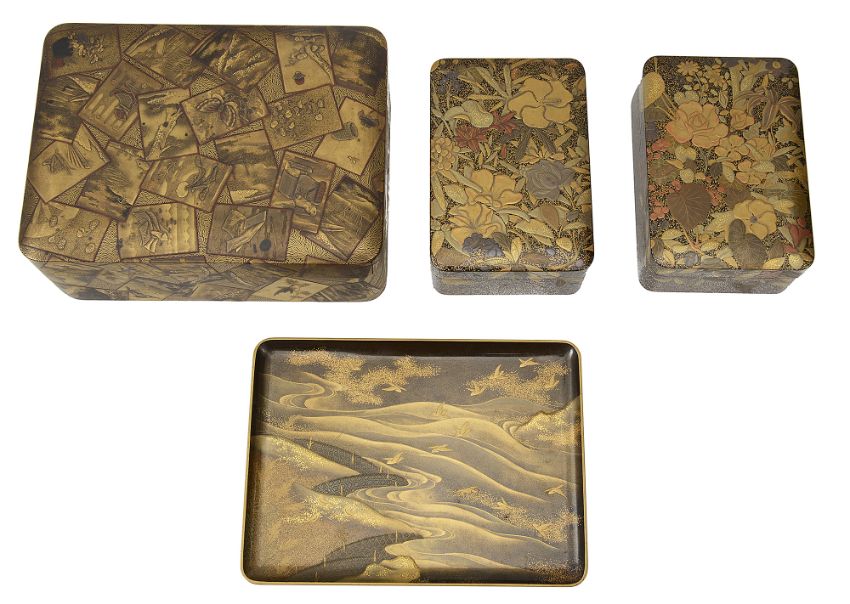 of rectangular form decorated in takamaki-e, togidashi maki-e, and kirikane, the exterior decorated with scattered cards variously depicting flora, fauna and objects, against a foliate ground, lid interior decorated with a picturesque misty landscape view of Mount Fuji with pine trees and house, containing a tray decorated with a riverscape with birds, boxes decorated profusely with flowers and the lid interiors with river scenes with a boat and cormorants and a jetty, interiors of nashiji