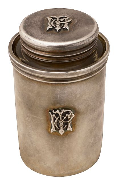 the beaker plain with raised monogram, interior gilt, the clear glass jar with pull off lid also with raised monogram, (2)