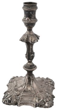 spool shaped sockets and knopped stems, raised on shaped spreading square base with shell corners,