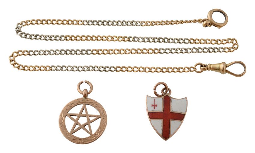 stamped to tag '18' and stamped to clasp '18' together with a 9ct gold Masonic charm, stamped '9.375' with Birmingham hallmarks and a 9ct gold, red and white enamel City of London cross shield, stamped '9ct'