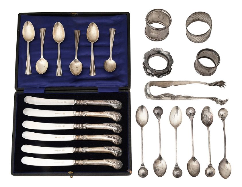 comprising an Edwardian matched set of six teaspoons with lawn bowl terminals, a set of six Art Deco teaspoons, a cased set of six tea knives with leaf capped pistol grip handles and stainless steel blades, a pair of Belgian .800 sugar tongs with lion paw terminals and two German .800 napkin rings and two others, (qty)