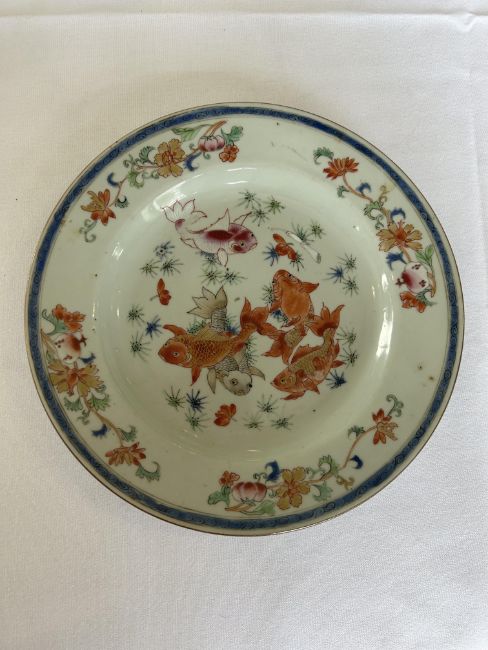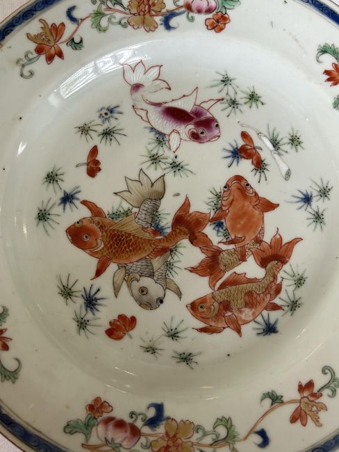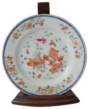 painted with five goldfish swimming amongst weed, the rim with four floral sprays, bears label verso 'Diane Knight Fine Porcelains Locust Valley, N.Y'.