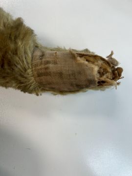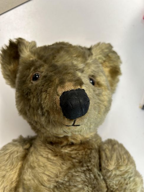 Condition: A pad of leather as been stitched to nose. Hole to one paw pad, wear to velvet pads. Growler not functioning. Wear around muzzle. mohair otherwise thick