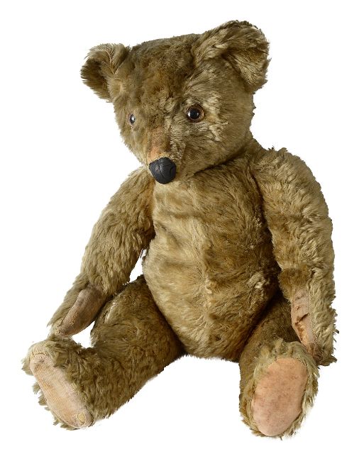 straw filled with two colour glass eyes, pointed nose with clipped muzzle, stitched mouth, swivel head, hump to back, jointed long shaped limbs, growler, stitched claws and felt pads