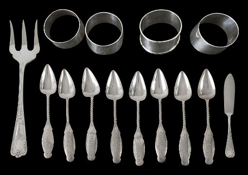first single sword mark and makers mark only, having twisted stems and and engraved handles together, initialled, with a bread fork, Sheffield, 1915, Mappin & Webb, initialled, a pair of elliptical napkin rings, Chester, 1913, Haseler Brother, with engraved decoration and bearing initials, two other napkin rings, initialled, and a butter knife, (qty)