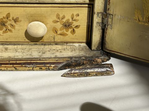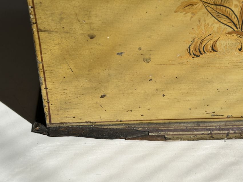 Condition: Chinoiserie with wear, chips and scratches. A particular area of wear to the lid. Fitted interior is a/f all divisions are present with lids but attention is needed. Chip to lid to top rear left corner. Base right hand corner of cabinet plinth is detached but present. Rear right hand corner of cabinet plinth is detahced and absent. Orignally on feet