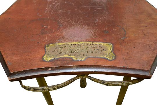 the triform mahogany top with gilt swags and with laurel leaf bands to the base, on reeded gilt metal supports, bearing brass inscription plaque dated 1906