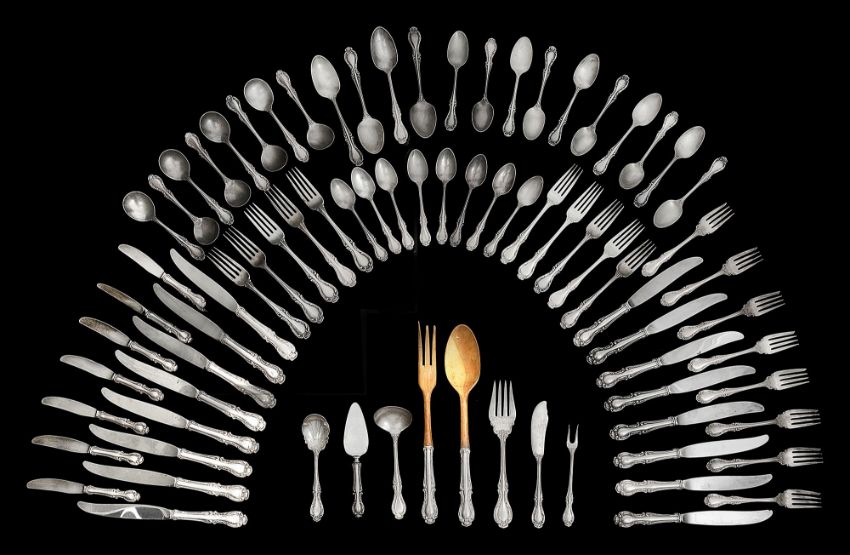 comprising, five table fork five dessert forks, eight salad forks, four dessert spoons, eight soup spoons, ten teaspoons, eight five o'clock teaspoons, a butter knife, cold meat fork, serving fork, sauce ladle and sugar spoon, eight table knives, eight dessert knives, seven butter spreaders, a pair of wooden salad servers and a serving slice all with filled silver handles and stainless steel blades, (qty)