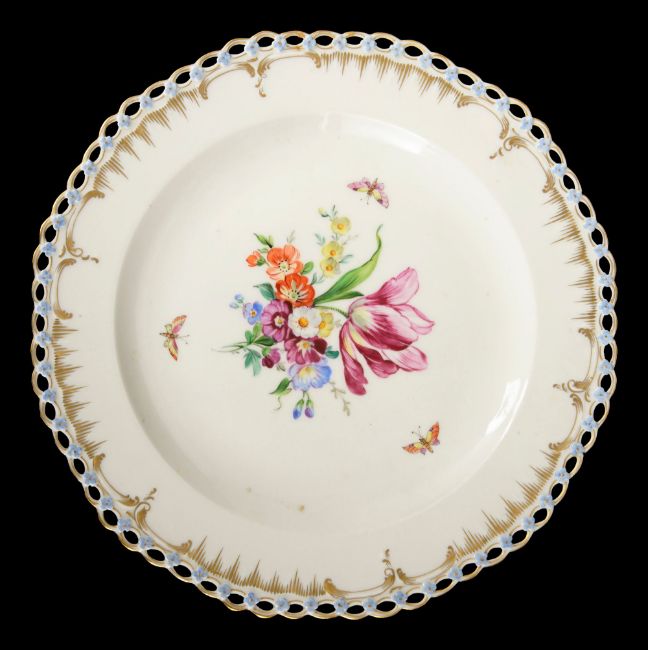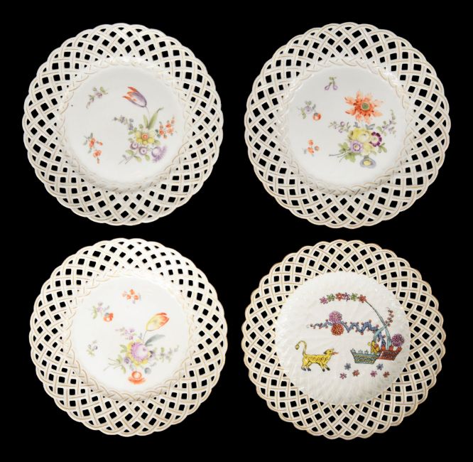 first pierced border moulded with forget me knots and scrolls, painted with floral spray and butterflies, underglaze blue sceptre mark, impressed 28, together with a basketweave moulded cabinet plate with pierced lattice border decorated in Kakiemon Yellow Tiger Tree of Life pattern, underglaze crossed swords mark with cancellation mark together with three cabinet plates with pierced lattice borders, painted with a spray of flowers and three scattered sprigs, underglaze blue mark for Meyer & Sohn, (5)