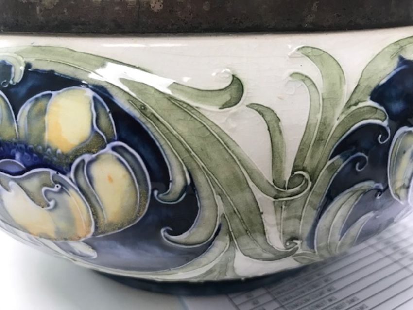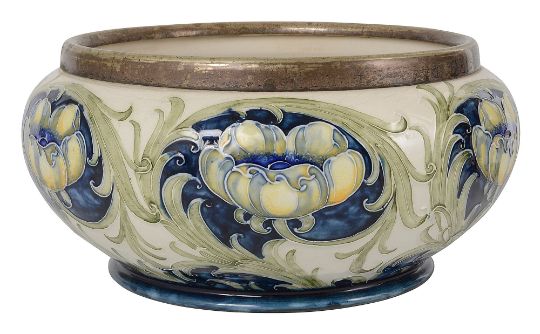 tube lined, with a silver plated rim and of squat bulbous form, underside signed and bearing stamp and monogram, 'JMc Macintyre Burslem England'