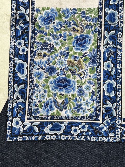 the front and back main panels embroidered with butterflies and peonies and dense foliage, on a cream ground with precious objects and clouds, densely floral embroidered black satin borders