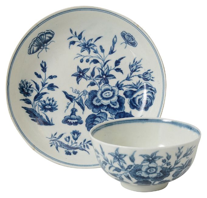 A First Period Worcester blue and white 'Three Flowers' Pattern tea bowl and saucer c.1770