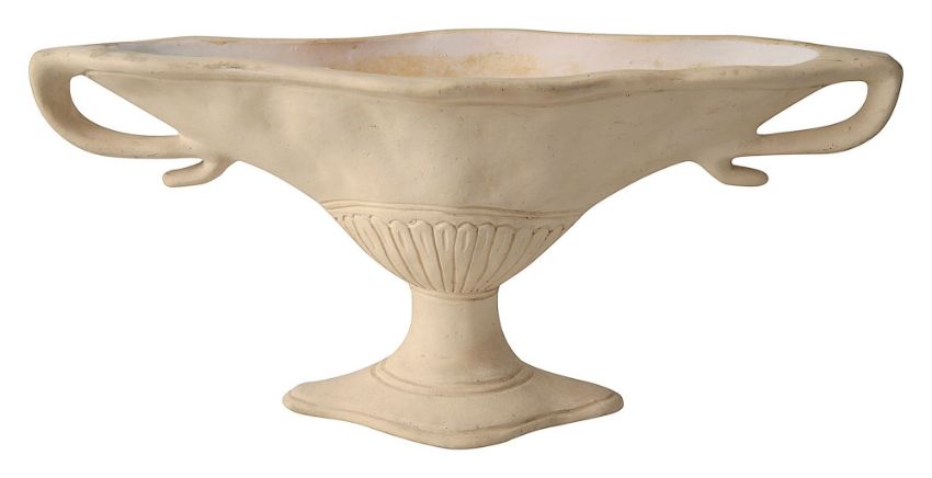 A mantel vase unglazed buff earthenware, elongated oval part form with twin loop handles, on a shaped pedestal foot, white glazed interior, impressed Constance Spry facsimile signature