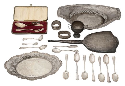 a set of seven Edwardian Hanoverian Rattail Teaspoons, London, 1903, Mackay & Chisholm, initialled, an oval dish with pierced border, a cased christening fork and spoon, a presentation twin handled trophy cup, an a/f hand mirror stamped sterling Birks, odd spoons, napkin rings etc. (qty)