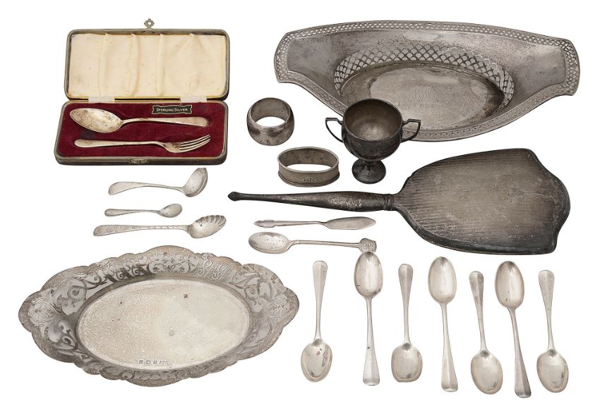 Condition: Dings and marks and knocks to basket, one bowl of teaspoons damaged, napkin rings with knocks, hand mirror a/f