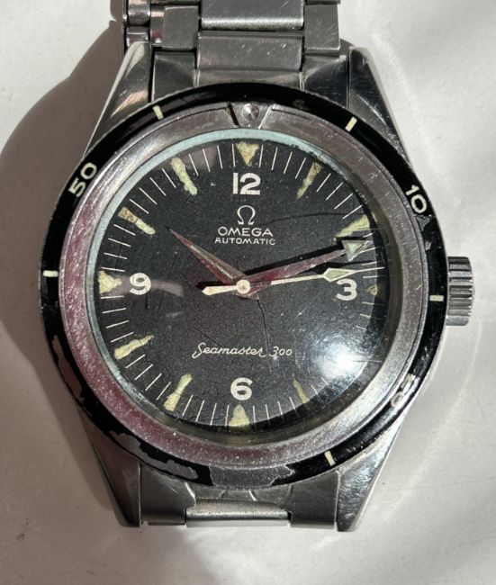 Condition: The bezel is worn in a couple of places and black insert has been lost. The luminous numerals have ' bled' in a couple of places. Appears to need of a good service. Bezel does move but is stiff. Movement runs but does stop. we cannot gurantee the full working order. Wear to steel commensurate with age and wear. White paint on strap which should scratch off