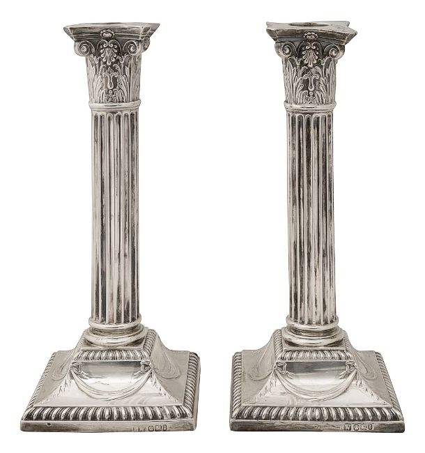 A pair of late Victorian silver Corinthian column candlesticks
