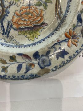 Condition: Service has wear and rubbing to gilt and occasional faults as listed below One dinner plate has a small chip to rim. One dinner plate with area of staining Three soup plates with a chip to rim. Two side plates have a chip to rim. The dessert bowls have wear and staining, rubbing to inside rims, one with chip. Large tureen cover has an old riveted repair and chips. A small side plate has chip to rim, Dessert tureen has been damaged and repaired - The lid has been broken into several peices and one legs has been repaire Smallest serving dish has a hairline, other smallest with rubbing. Serving dish with rubbing to interior