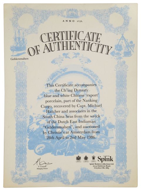 decorated with a watery landscape with pine tress and figures, interior with a geometric band, bears Christies paper lot number label and sold with certificate of authenticity issued by Spink