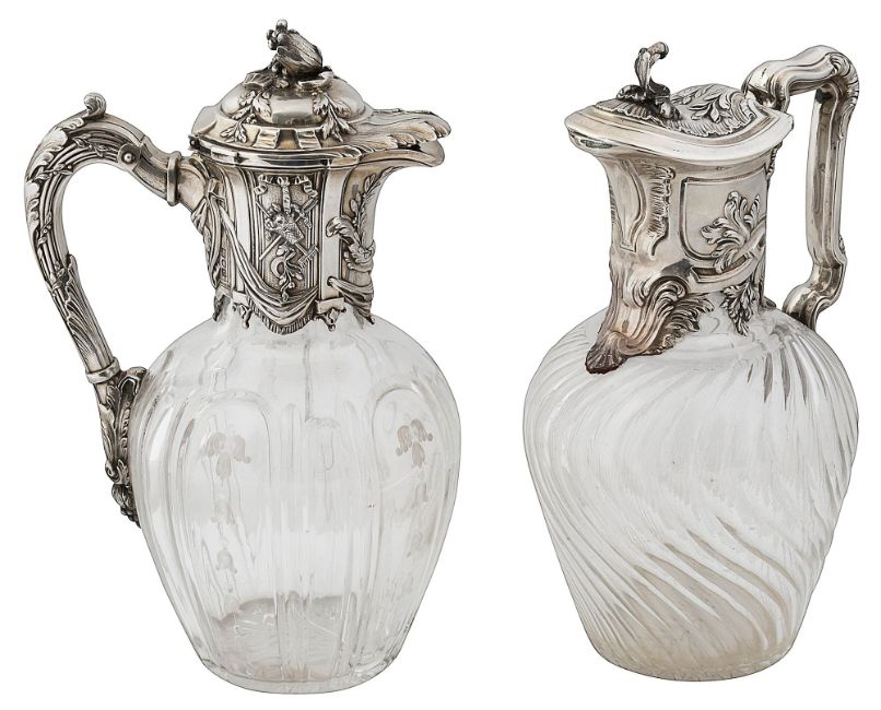both London, 1898 Francis Higgins II , acanthus and scroll embossed mount and handle with hinged cover and foliate scroll finial, clear wrythen fluted body, second mount and handle embossed in Louis XV style with acanthus leaf, tambourine and crossed horn, flower basket and swags, clear body with cut and engraved with trailing harebells, (2)