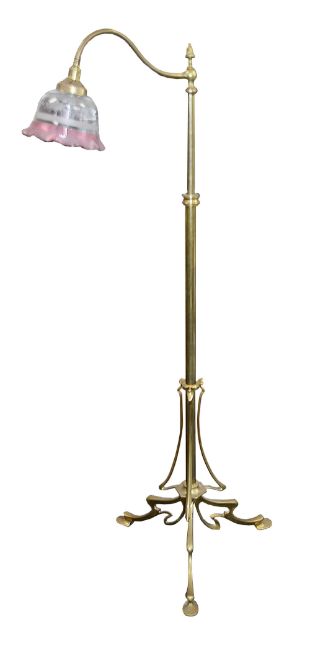 An Edwardian brass reading standard lampin the manner of W A S Bensonthe S-scroll swing arm with an associated cranberry glass shade with etched details, height adjustable and on a tubular stem ending in a whiplash open work triform baseheight 149cmCondition: In good condition overall. When extended it will not lock firmly in place to maintain the new height.