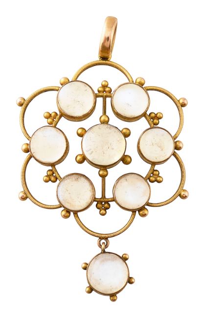 of bead and textured wirework and hexafoil design and set with eight moonstone cabochons, and plaque stamped '9ct' applied to the reverse (replacement suspensory loop)