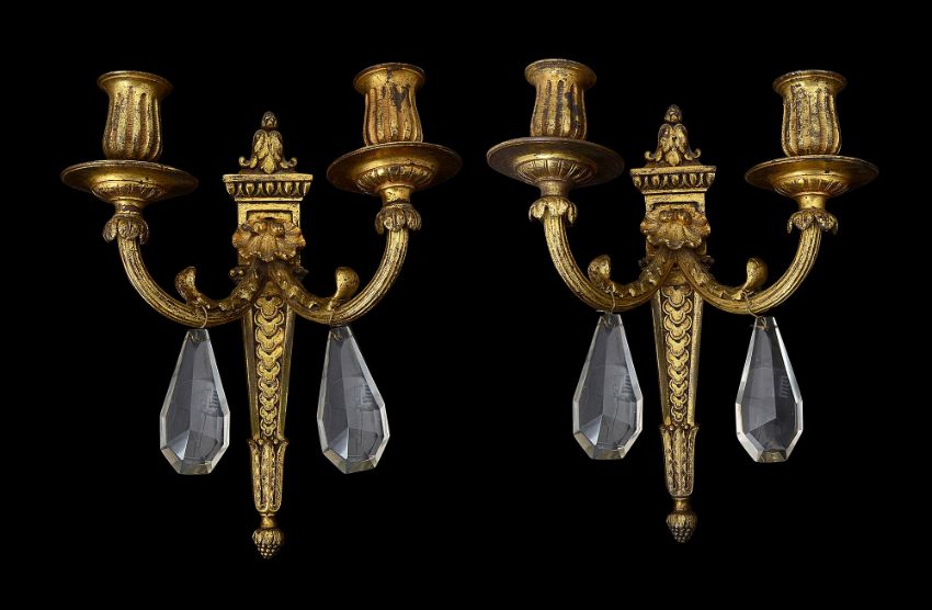 A pair of Louis XVI style gilt metal wall lightsearly 20th centurythe gadrooned, lappet clad tapered backplates with shells and fluted arms supporting drip pans and fluted sconces, each arm with an associated facetted drop and fitted with a glass drip pan (2)height 27cm, width 20cmCondition: Good condition. Small area of one fluted sconce worn through. The drops look to be a later addition.