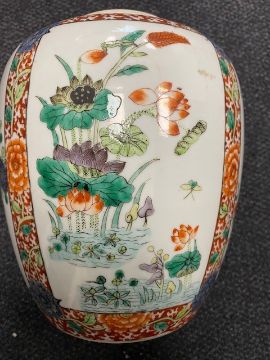 of ovoid tapering form, decorated with panels of lotus, prunus, chrysanthemums, other flowers and insects, iron red scrolling foliate borders with trailing flowers, six character kangxi mark within double ring in underglaze blue