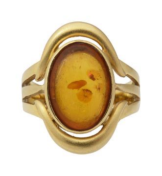 An amber ringthe oval light coloured amber cabochon (untested) collet within a scrolling bloomed openwork frame, trifurcated shoulders and plain tapering shank stamped '18K 750'ring size M1/2, 8.1gCondition: Overall condition good.Amber with minor crazing to the top and dents and containing four 'lily pad' type inclusions to the centre.Setting with little sign of wear.