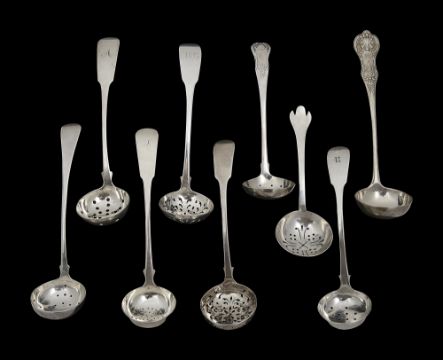 to include a an Old English pattern sifter spoon, Edinburgh, 1818, James Newlands, a single struck Kings pattern ladle, 1823, Andrew Wilkie, two other fiddle pattern sifter spoons both Edinburgh, three other George IV/William fiddle pattern sifter spoons, all Glasgow, a Victorian Kings pattern sauce ladle, Glasgow 1866, William Coghill
