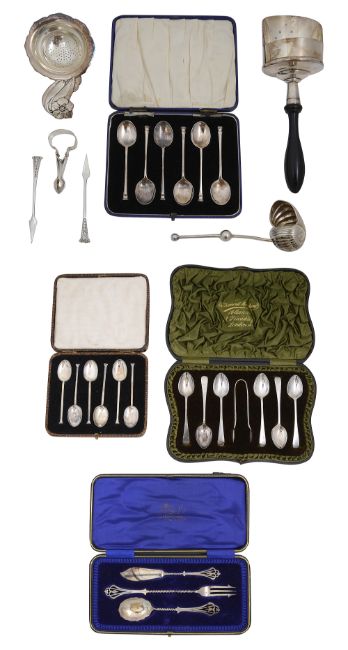 Cased sets of silver spoons and plated items
