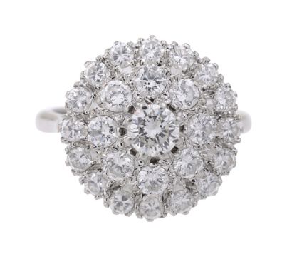 A diamond-set cluster ringcentrally-set with a brilliant-cut diamond to the two tired surround of similar-cut diamonds, the plain tapering shank stamped '18ct PLAT'ring size M,cluster diameter approximately 1.6cm, 6.0gCondition: Overall condition good/very good.Bright diamonds with good clarity and colour