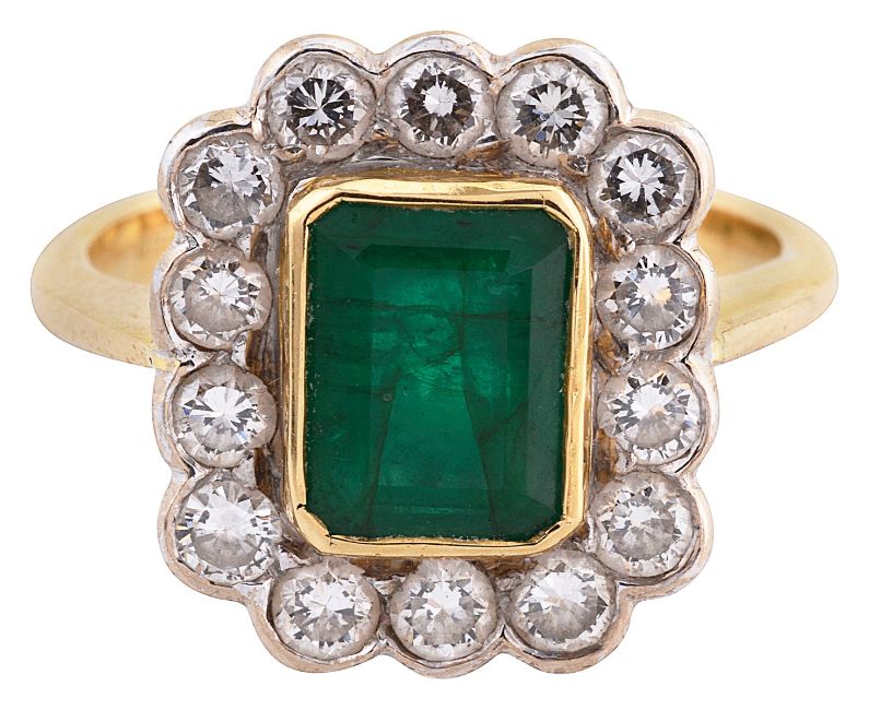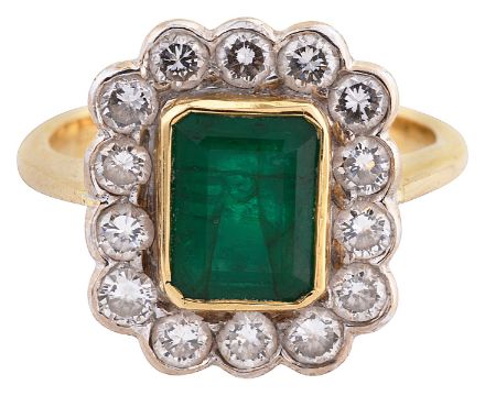 An emerald and diamond-set ringthe central rectangular step cornered-cut emerald measuring 7.5mm x 6.0mm x 3.7mm collet-set above the surround of fourteen brilliant-cut diamonds to the 18ct gold tapering shank, import hallmarkring size K, 5.6GCondition: Overall condition good/very goodEmerald: approximate estimated weight 1.50ctDiamonds: approximately +/- 1ct