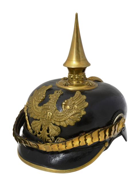 leather bodied shell, gilt brass Prussian helmet plate with motto, scaled brass chinstrap, officers pattern Reichs and Prussian state cockades, brass spike with fixing stars, brass spine and trim, interior with leather sweatband and cloth lining