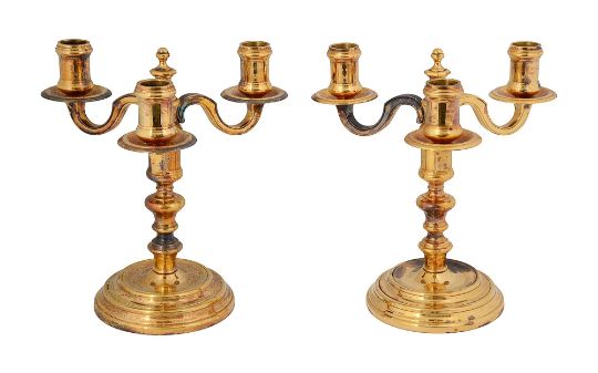 A pair of French Christofle gilt three light candelabra
