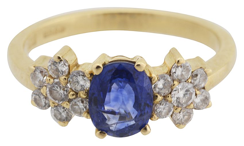 A sapphire and diamond ringthe central oval mixed-cut sapphire with a floral diamond-set cluster comprising of seven brilliant-cut diamonds to either side, to the hallmarked plain 18ct gold shank ring sizes O/P, 4.0gCondition: Overall condition good/very goodSapphire a strong blue . A slight window with an inclusion to one end .Diamond clusters bright