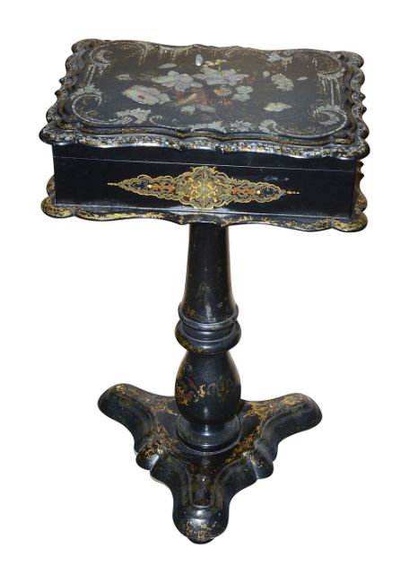 A Victorian black papier mache and mother of pearl work box