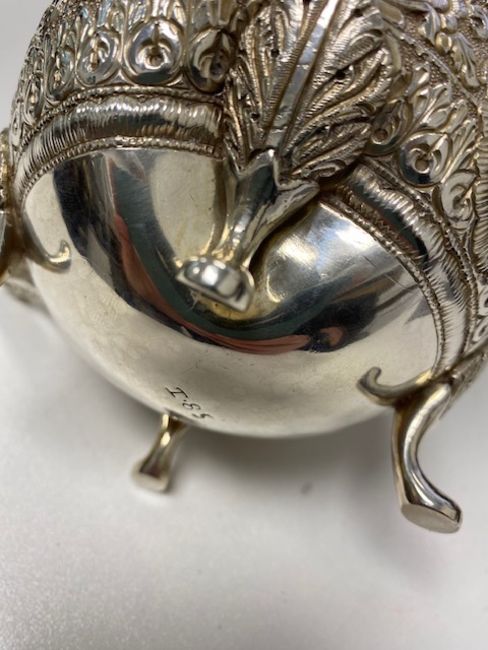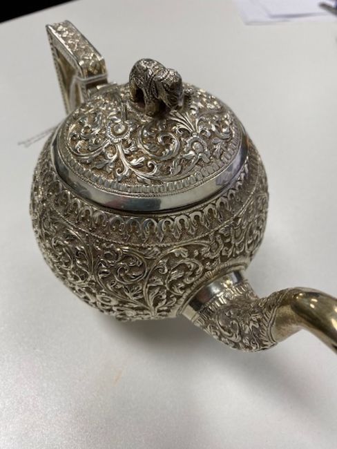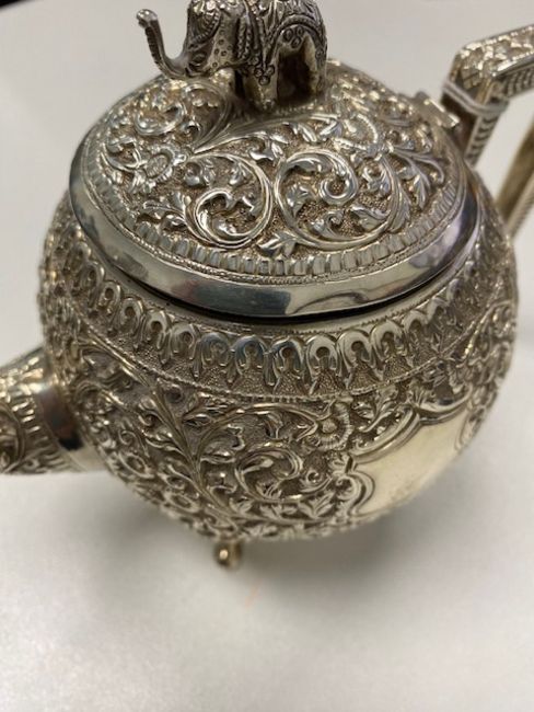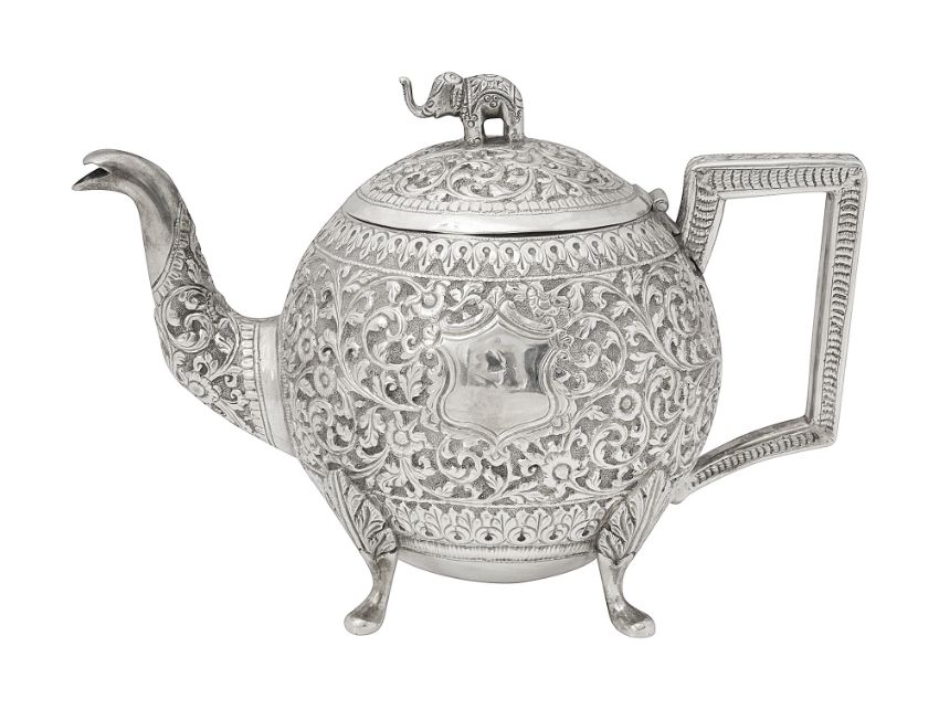 of spherical form with hinged domed silver cover with cast elephant finial, all over scrolling foliate repousse decoration and angular handle, on feet