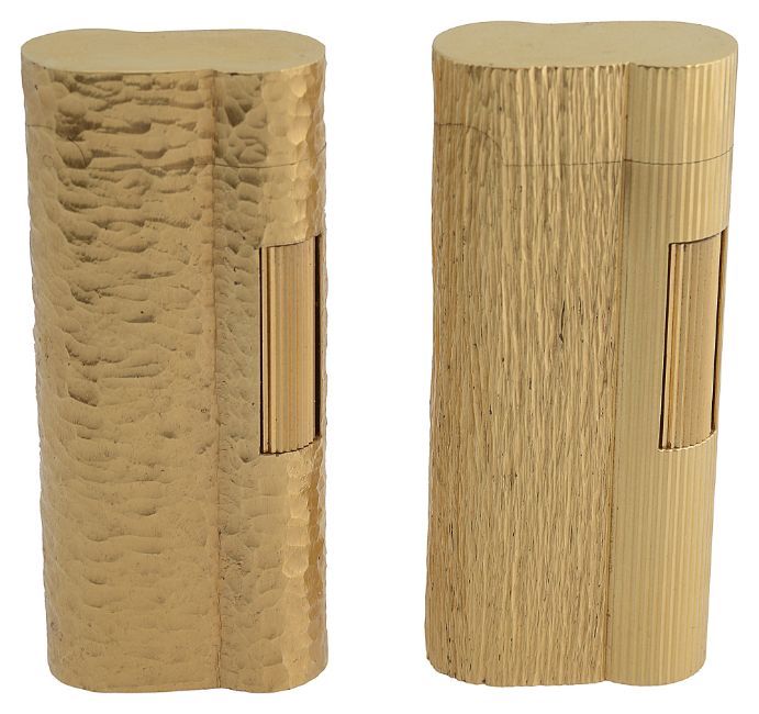 the first a Dunhill S style lighter with turned engine design, 20 microns, engraved to base 'E30611 Made in England'; the second, Dunhill S style light, with a hammered design, 20 microns, engraved to base 'C96151 Made in England' (2)